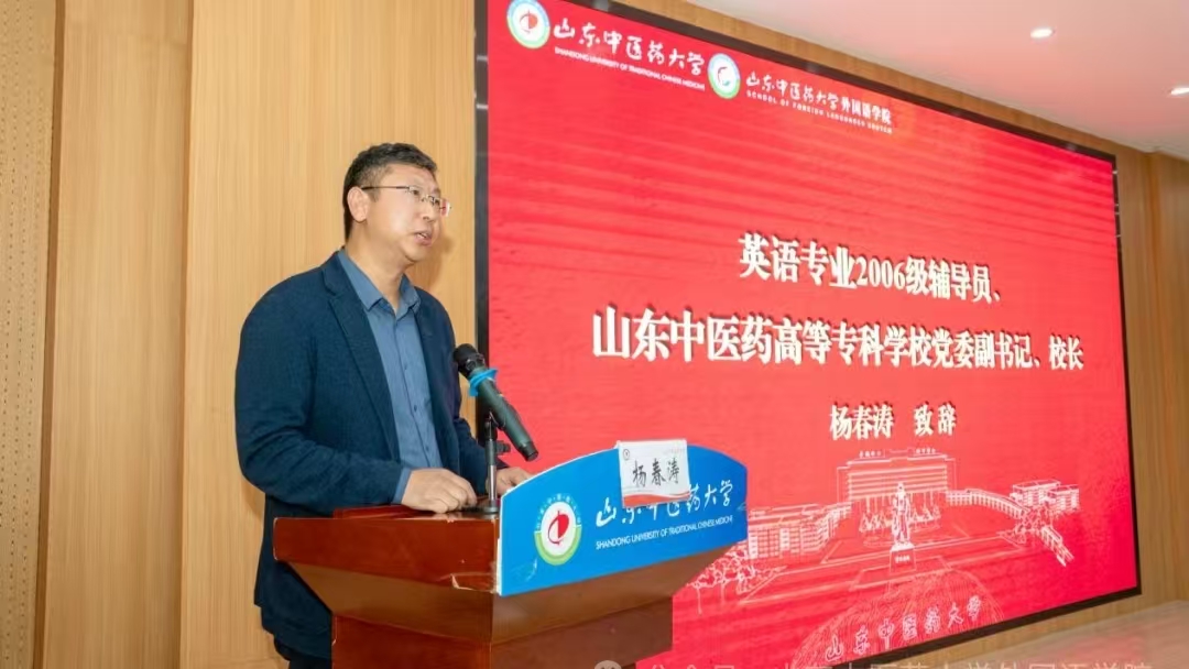 校友会”的决定》。2006级英语专业辅导员、山东中医药高等专科学校党委副书记、校长杨春涛致辞。英语专业教师代表闵玲教授发言。
