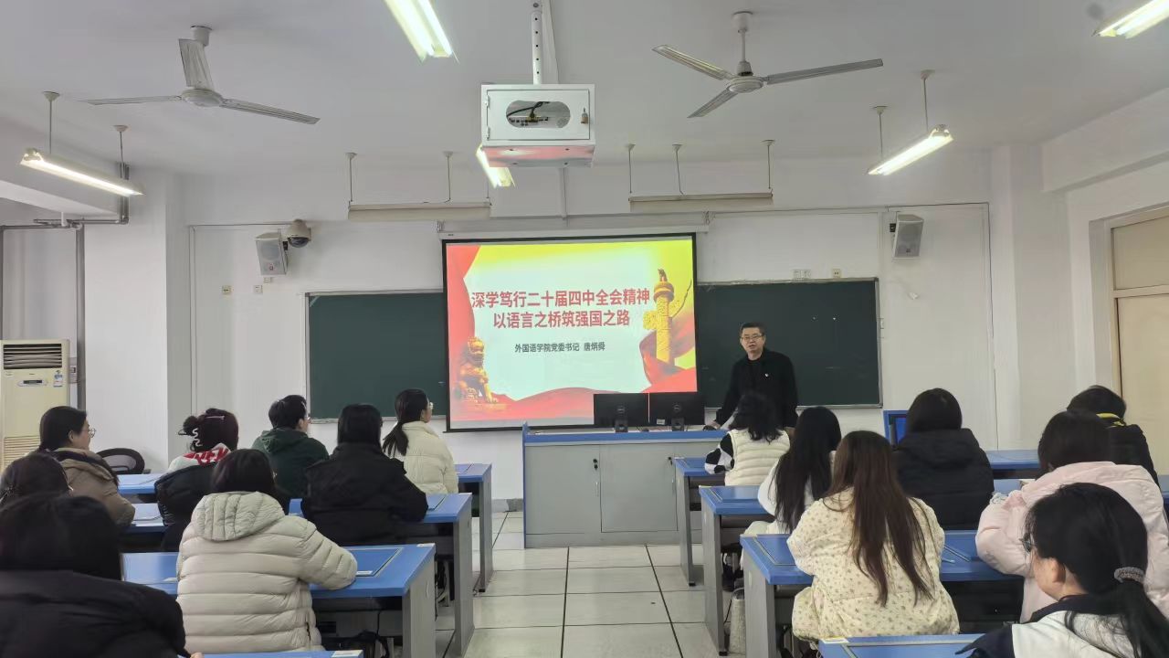 唐炳舜以“深学笃行党的二十届四中全会精神,以语言之桥筑强国之路”为主题,结合学院实际和外语专业特色,从历史维度、国际维度、青年成长维度解读全会的重大意义,从坚持党的全面领导、高质量发展、对外开放、教育科技人才一体化、人民至上等五个方面把握全会精神的核心要义。唐炳舜强调,党的二十届四中全会与青年学子的成长成才息息相关,青年一代既是国家发展的见证者,更是民族复兴的生力军。外语专业的学生肩负着讲好中国故事、传播中国声音的时代使命,要将个人理想融入国家发展大局,在学好专业知识的同时,深刻理解全会精神中关于“坚持对外开放”“人民至上”等重要论述,努力成为具有家国情怀、专业素养、全球视野的复合型外语人才。他鼓励学生干部要发挥先锋模范作用,带头学习、带头宣讲、带头实践,以实际行动影响和带动身边同学,把全会精神转化为勤奋学习、练就本领的强大动力,以服务社会、报效祖国的实际行动,奋力书写挺膺担当的青春华章。